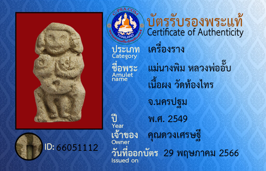 ชื่อพระ :แม่นางพิม หลวงพ่ออั๊บ เนื้อผง วัดท้องไทร จ.นครปฐม