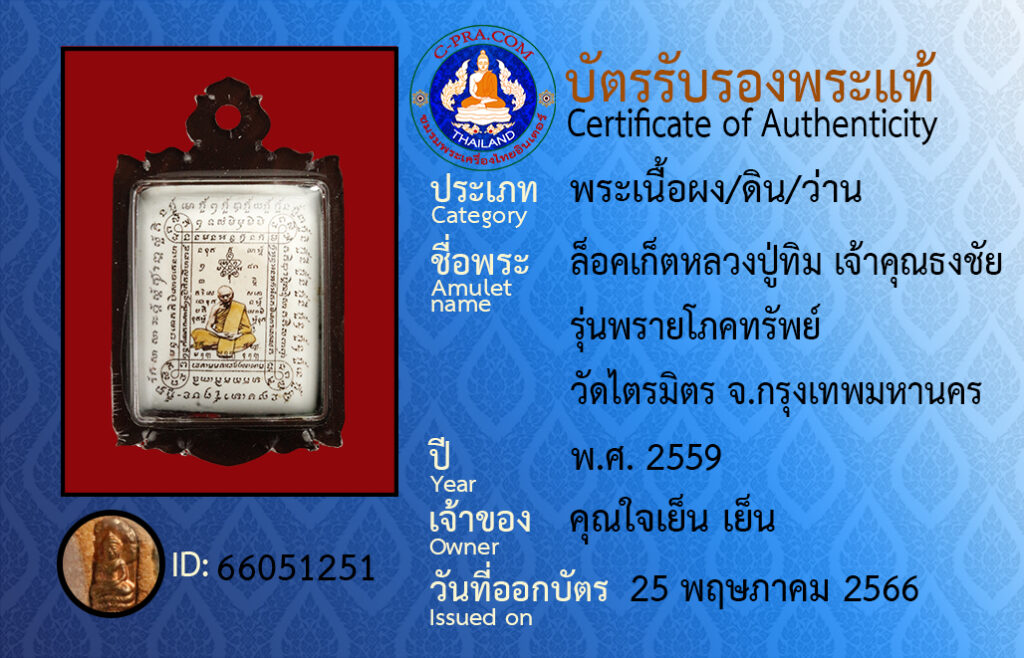 ชื่อพระ :ล็อคเก็ตหลวงปุ่ทิม เจ้าคุณธงชัย รุ่นพรายโภคทรัพย์ วัดไตรมิตร จ.กรุงเทพมหานคร