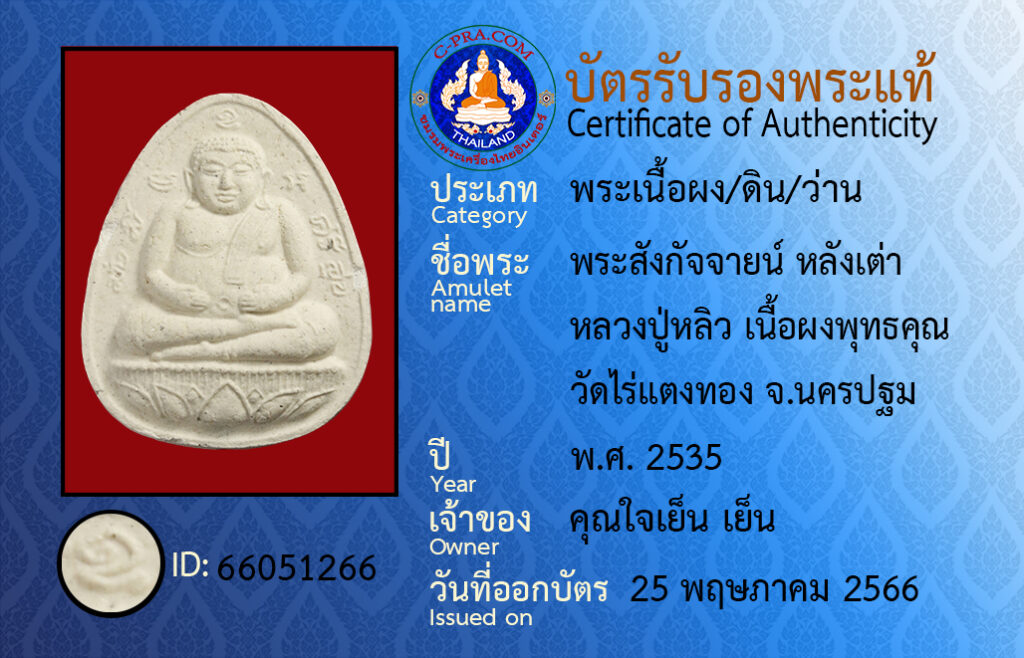 Amulet name : pra sang-gat-jai lang tao luang pu liw neua pong put-ta-kun wat rai-taeng-tong Nakonpatom