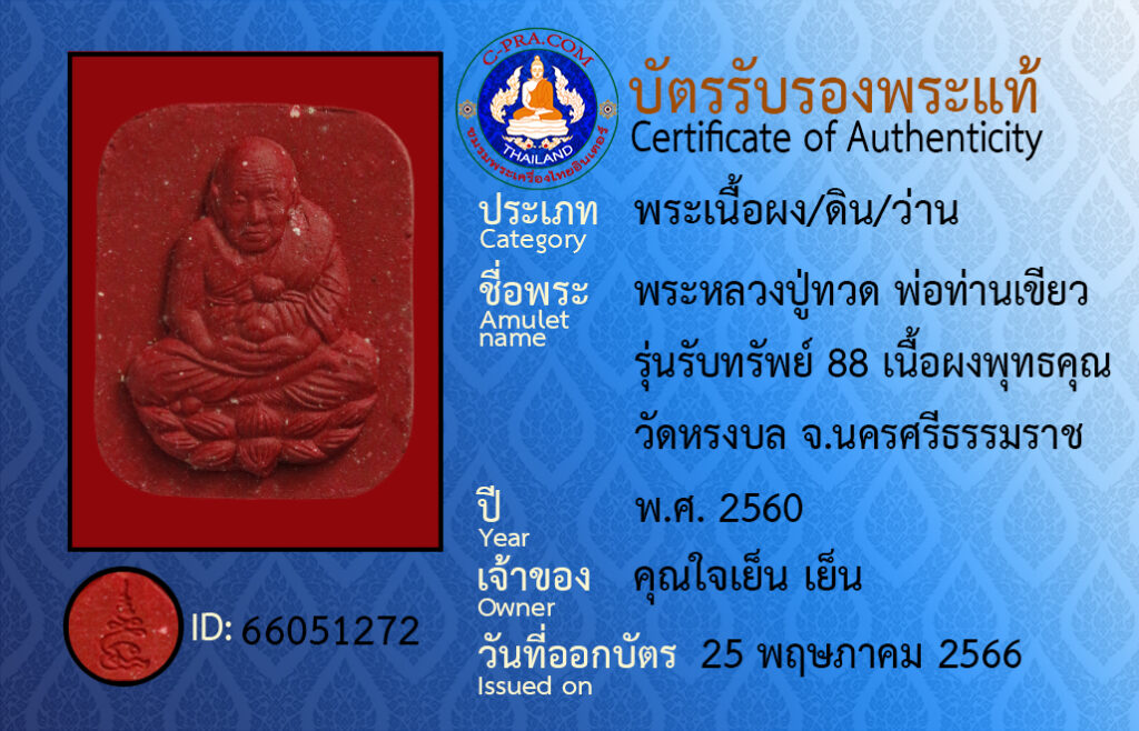 Amulet name : pra luang poo tuad por tan kieow run rap sap 88 neua pong put-ta-kun wat rong bon Na-kon-see-tam-ma-rat