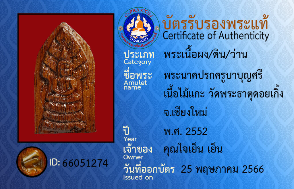 Amulet name : pra nak prok kroo ba bun see neua mai gae wat pra tat doi gerng chiang-mai