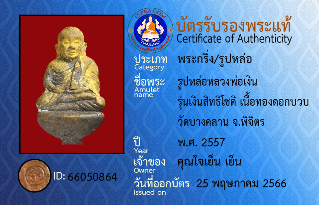 ชื่อพระ :รูปหล่อหลวงพ่อเงิน รุ่นเงินสิทธิโชติ เนื้อทองดอกบวบ วัดบางคลาน จ.พิจิตร