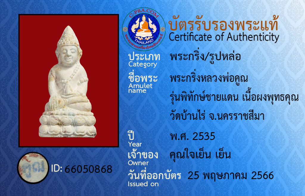 Amulet name : pra ging luang por koon run pi tak chai dan neua pong put ta kun wat ban rai Na-kon rat see-ma