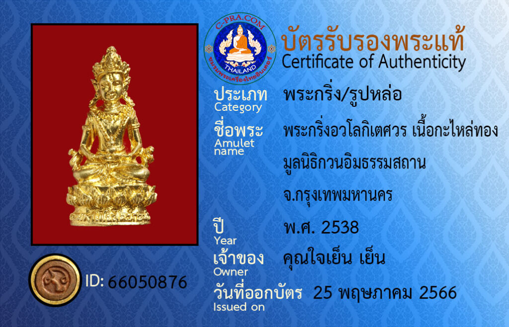 ชื่อพระ :พระกริ่งอวโลกิเตศวร เนื้อกะไหล่ทอง มูลนิธิกวนอิมธรรมสถาน จ.กรุงเทพมหานคร
