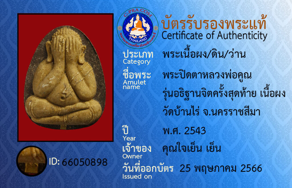 Amulet name : pra pit ta luang por koon run a-ti tan jit krang sut tai neua pong wat ban rai na-kon rat see-ma