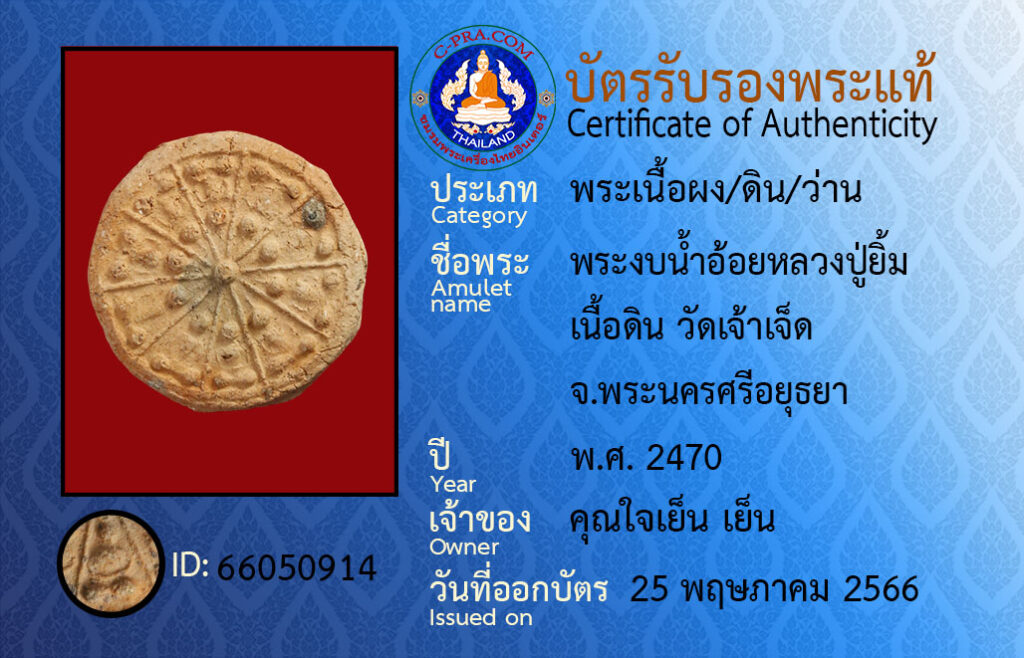 Amulet name : pra ngop nam oi luang poo yim neua din wat jao-jet pra na-kon see a-yut-ta-yaa