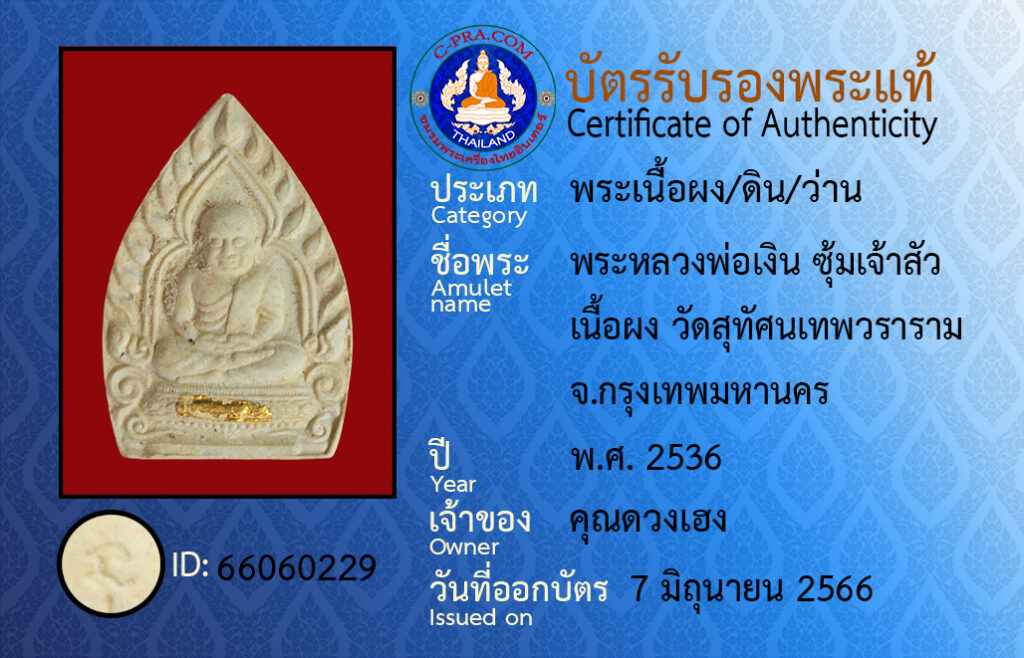 Amulet name : pra luang por ngern sum jao-sua neua pong wat-su-tat tep-wa-ra-ram