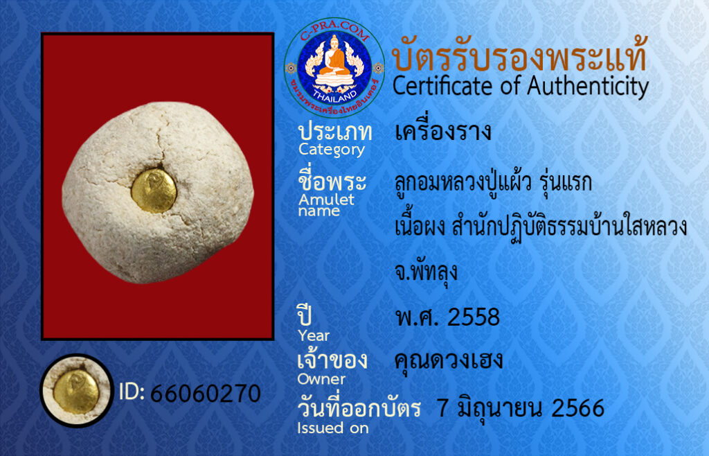 Amulet name : look om luang pu paew run raek neua pong sam-nak pa-ti-bat tam ban sai luang pat-ta-lung