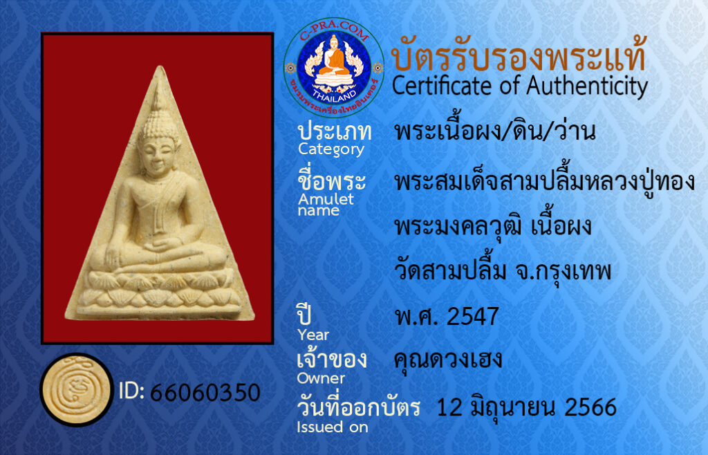 ชื่อพระ :พระสมเด็จสามปลื้มหลวงปู่ทอง พระมงคลวุฒิ เนื้อผง วัดสามปลื้ม จ.กรุงเทพ