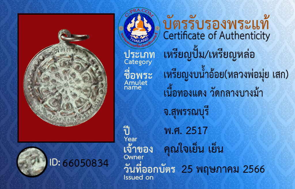 ชื่อพระ :เหรียญงบน้ำอ้อย(หลวงพ่อมุ่ย เสก ) เนื้อทองแดง วัดกลางบางม้า จ.สุพรรณบุรี
