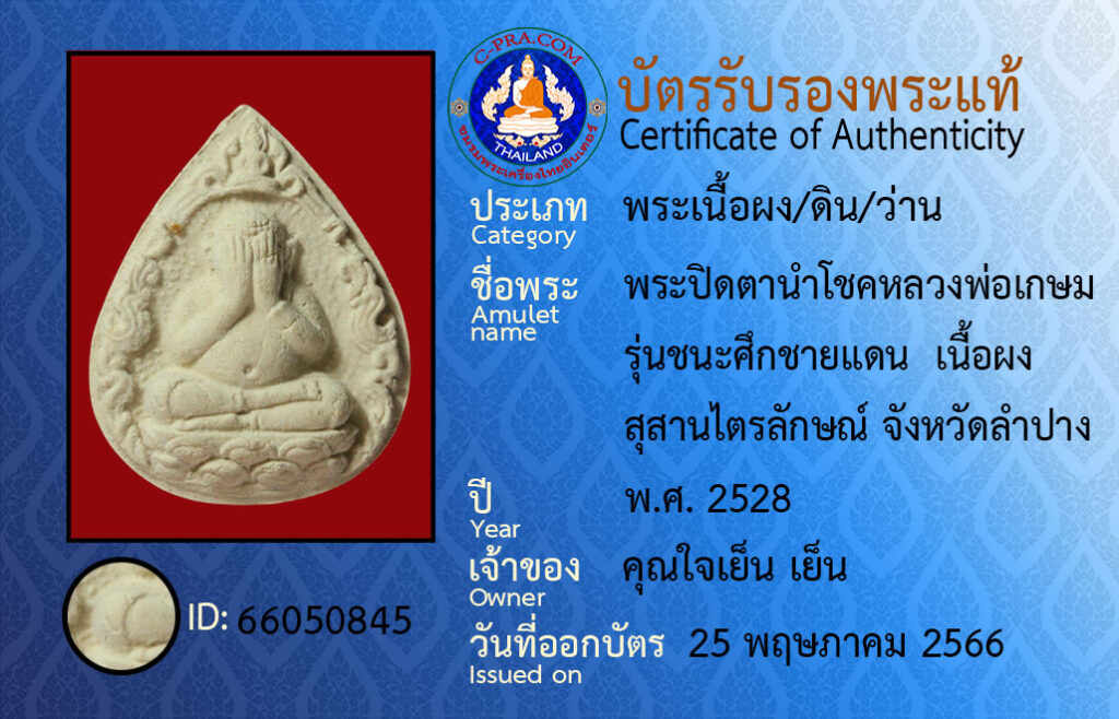 Amulet name : pra pit ta nam chohk luang por ga-sem run cha-na seuk chai daen neua pong su-san trai lak Lam-pang