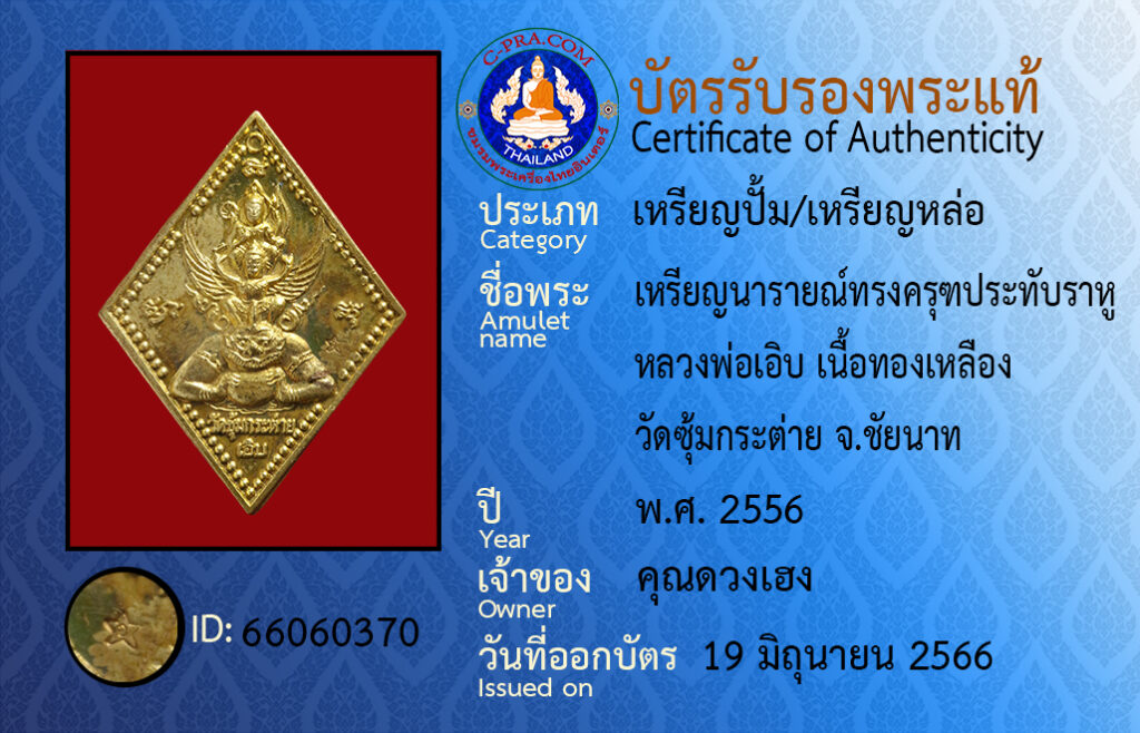 ชื่อพร :เหรียญนารายณ์ทรงครุฑประทับหู หลวงพ่อเอิบ เนื้อทองเหลือง วัดซุ้มกระต่าย จ.ชัยนาท