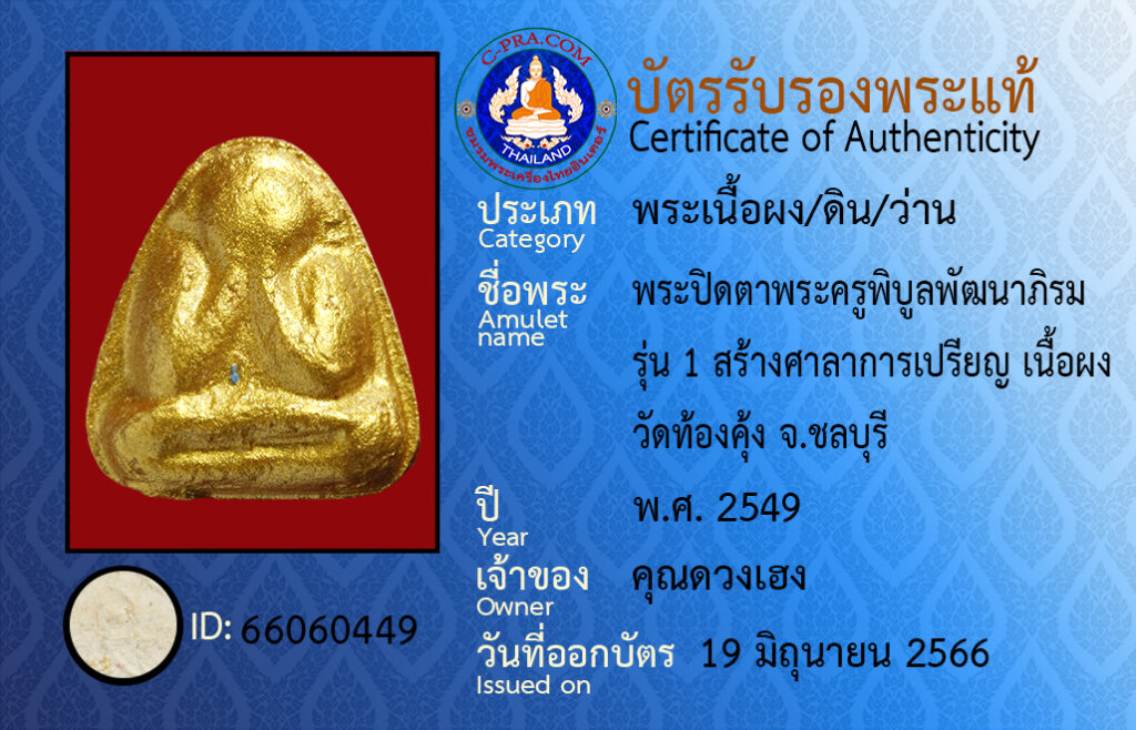 Amulet name : pra pit ta pra kroo pi boon pat-ta-na pi rom run 1 neua pong wat hong kung chon bu-ree