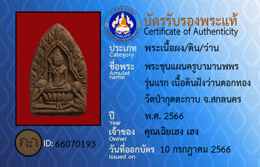 ชื่อพระ :พระขุนแผนครูบามานพพร รุ่นแรก เนื้อดินฝังว่านดอกทอง วัดป่ากุดตะกาบ จ.สกลนคร