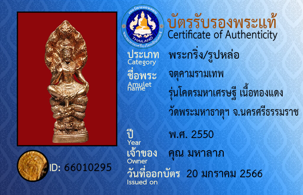 ชื่อพระ : จตุคามรามเทพ รุ่นโคตรมหาเศรษฐี เนื้อทองเเดง วัดพระมหาธาตุฯ จ.นครศรีธรรมราช