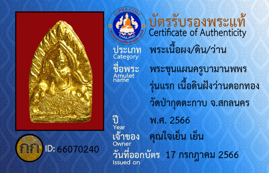 Amulet name: pra kun paen kroo ba ma-nop pon run raek neua din fang wan dok tong wat ba gut-ta-gap Sakon Nakhon