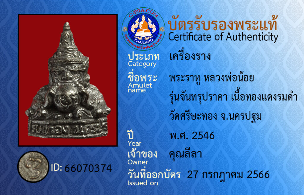 ชื่อพร :พระราหู หลวงพ่อน้อย รุ่นจันทรุปราคา เนื้อทองแดงรมดำ วัดศรีษะทอง จ.นครปฐม