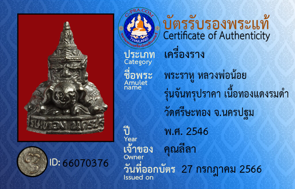 ชื่อพร :พระราหู หลวงพ่อน้อย รุ่นจันทรุปราคา เนื้อทองแดงรมดำ วัดศรีษะทอง จ.นครปฐม