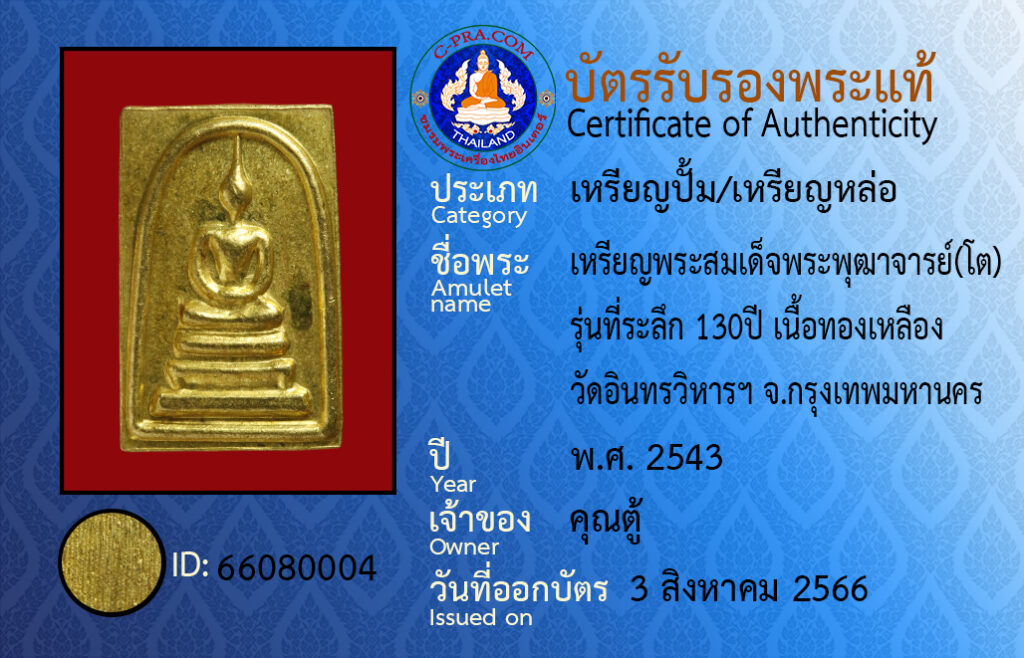 Amulet name :rian pra som det pra pu ta-jan toh · run tee ra-leuk · 130 year · neuua tong leuuang · wat in-ton-wi han Bangkok