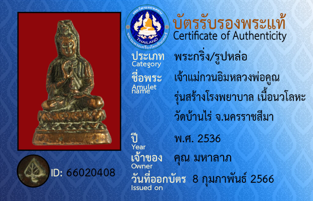 ชื่อพระ :เจ้าแม่กวนอิมหลวงพ่อคูณ รุ่นสร้างโรงพยาบาล เนื้อนวะโลหะ วัดบ้านไร่ จ.นครราชสีมา