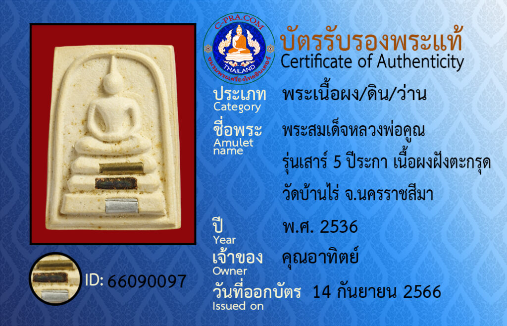 Amulet name : pra som det luang por koon run sao 5 pee ra ga neua pong fang ta-grut wat ban rai na-kon rat see-ma