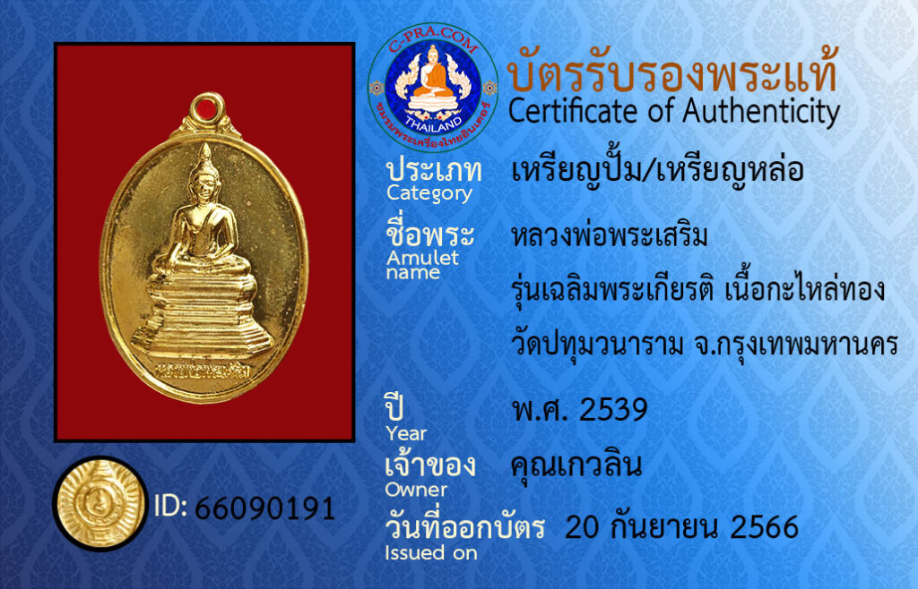 ชื่อพระ หลวงพ่อพระเสริม รุ่นเฉลิมพระเกียรติ เนื้อกะไหล่ทอง วัดปทุมวนาราม จ.กรุงเทพมหานคร