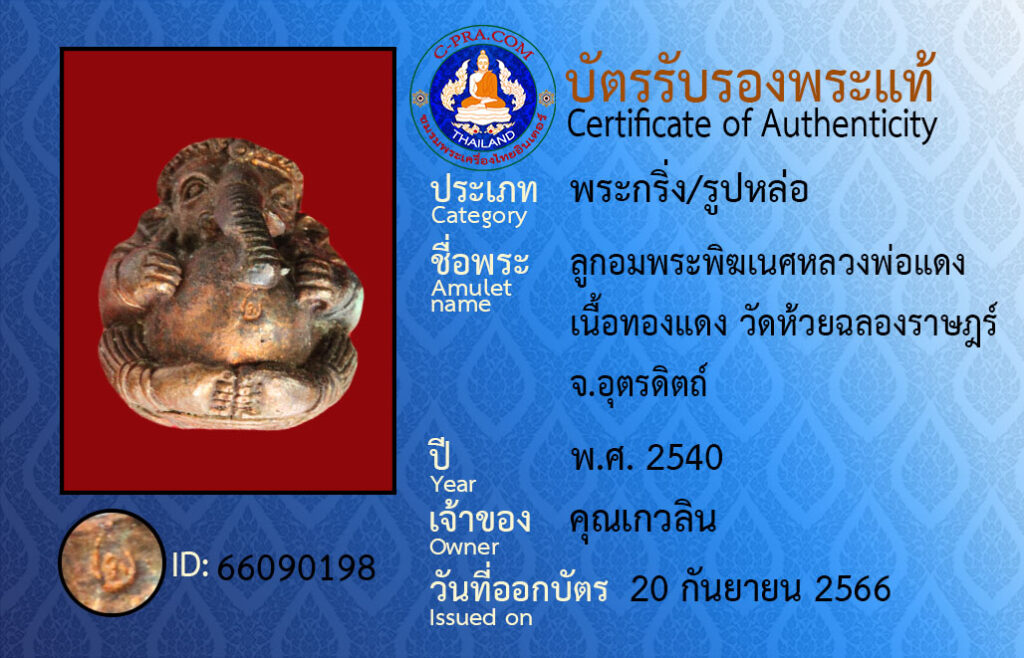 ชื่อพระ :ลูกอมพระพิฆเนศหลวงพ่อแดง เนื้อทองแดง วัดห้วยฉลองราษฎร์ จ.อุตรดิตถ์