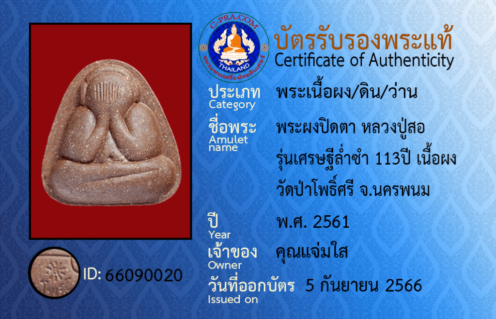ชื่อพระ:พระผงปิดตา หลวงปู่สอ รุ่นเศรษฐีล่ำซำ 113ปี เนื้อผง วัดป่าโพธิ์ศรี จ.นครพนม