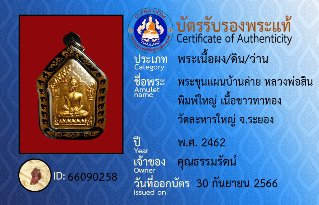 ชื่อพระ: พระขุนแผนบ้านค่าย หลวงพ่อสิน พิมพ์ใหญ่ เนื้อขาวทาทอง วัดละหารใหญ่ จ.ระยอง