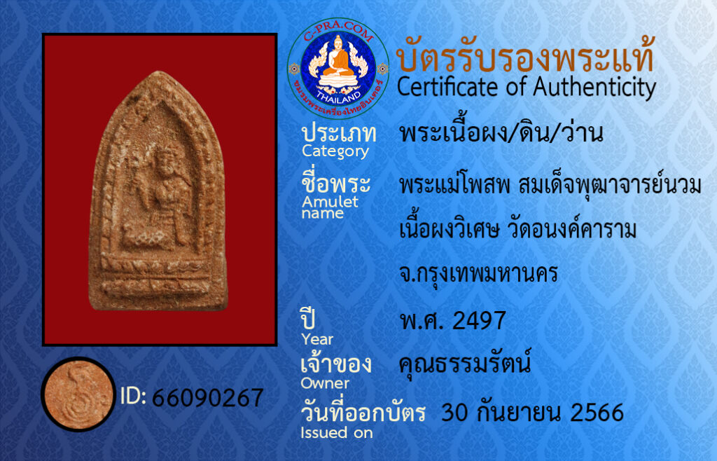 Amulet: Pra mae poh-sop · som det put-taa-jaan nuam · neua pong wi-set · wat a-nong ka ram · Bangkok