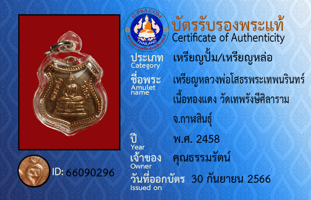 ชื่อพระ: เหรียญหลวงพ่อโสธรพระเทพนรินทร์ เนื้อทองแดง วัดเทพรังษีศิลาราม จ.กาฬสินธุ์