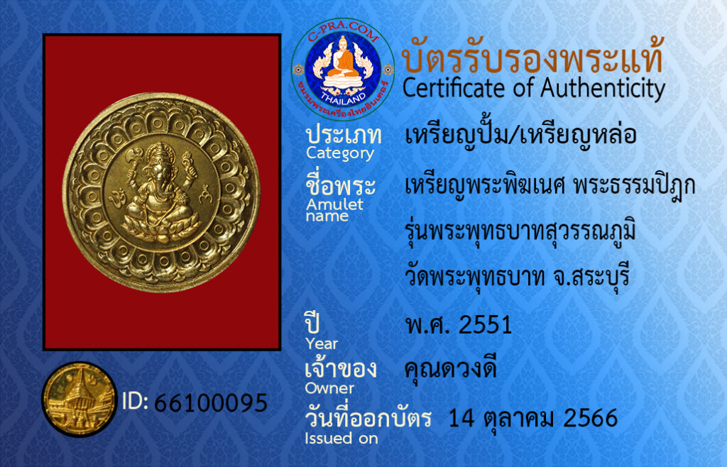 ชื่อพระ: เหรียญพระพิฆเนศ พระธรรมปิฎก รุ่นพระพุทธบาทสุวรรณภูมิ วัดพระพุทธบาท จ.สระบุรี