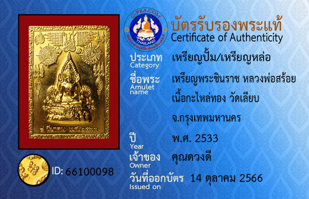 ชื่อพระ: เหรียญพระชินราช หลวงพ่อสร้อย เนื้อกะไหล่ทอง วัดเลียบ จ.กรุงเทพมหานคร