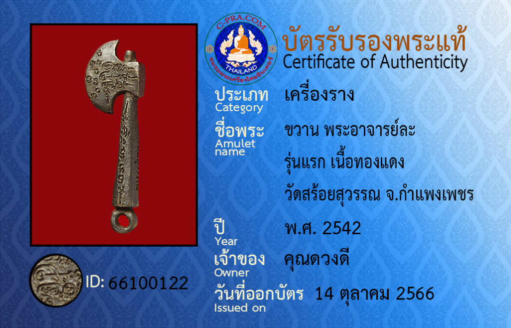 ชื่อพระ: ขวาน พระอาจารย์ละ รุ่นแรก เนื้อทองแดง วัดสร้อยสุวรรณ จ.กำแพงเพชร