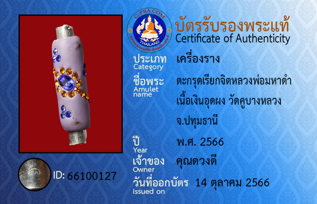 ชื่อพระ: ตะกรุดเรียกจิตหลวงพ่อมหาดำ เนื้อเงินอุดผง วัดคูบางหลวง จ.ปทุมธานี