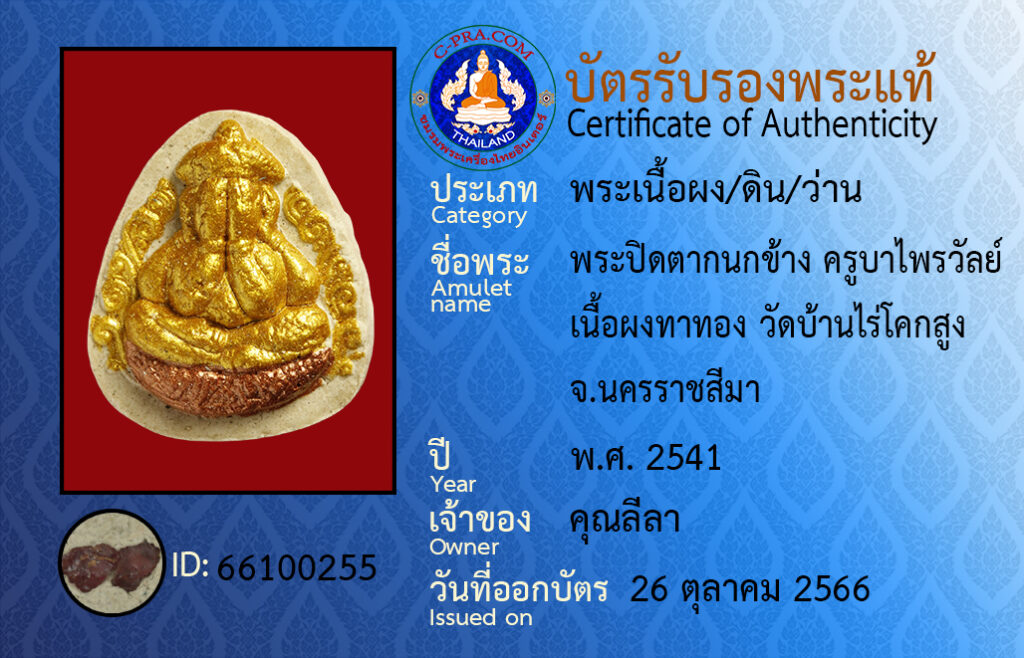ชื่อพระ :พระปิดตากนกข้าง ครูบาไพรวัลย์ เนื้อผงทาทอง วัดบ้านไร่โคกสูง จ.นครราชสีมา