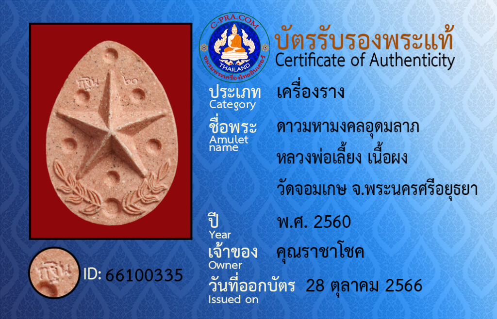 ชื่อพระ :ดาวมหามงคลอุดมลาภ หลวงพ่อเลี้ยง เนื้อผง วัดจอมเกษ จ.พระนครศรีอยุธยา