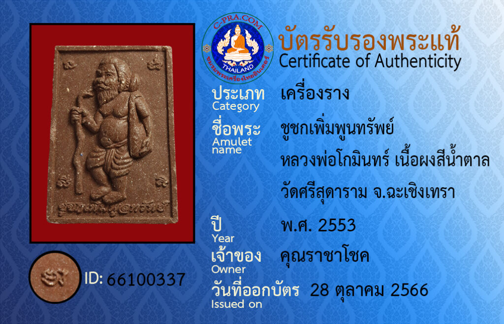 ชื่อพระ :ชูชกเพิ่มพูนทรัพย์ หลวงพ่อโกมินทร์ เนื้อผงสีน้ำตาล วัดศรีสุดาราม จ.ฉะเชิงเทรา