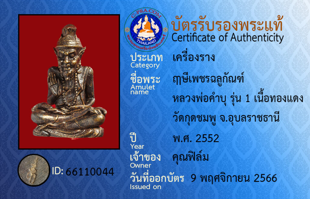 Amulet name : Reu-see pet-cha-loo-gan · luang por kam bu · run neung neua tong daeng · wat gut-chom-poo Ubon Ratchathani Province