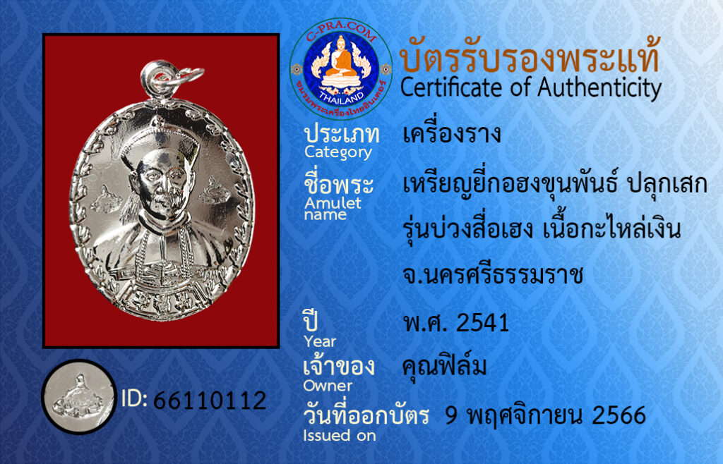 ชื่อพระ :เหรียญยี่กอฮงขุนพันธ์ ปลุกเสก รุ่นบ่วงสื่อเฮง เนื้อกะไหล่เงิน จ.นครศรีธรรมราช