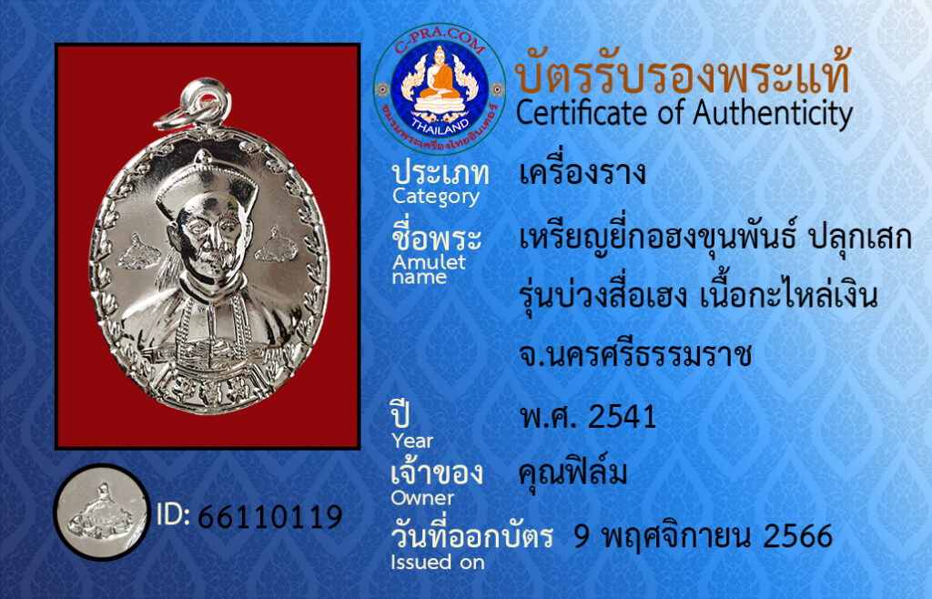 ชื่อพระ :เหรียญยี่กอฮงขุนพันธ์ ปลุกเสก รุ่นบ่วงสื่อเฮง เนื้อกะไหล่เงิน จ.นครศรีธรรมราช