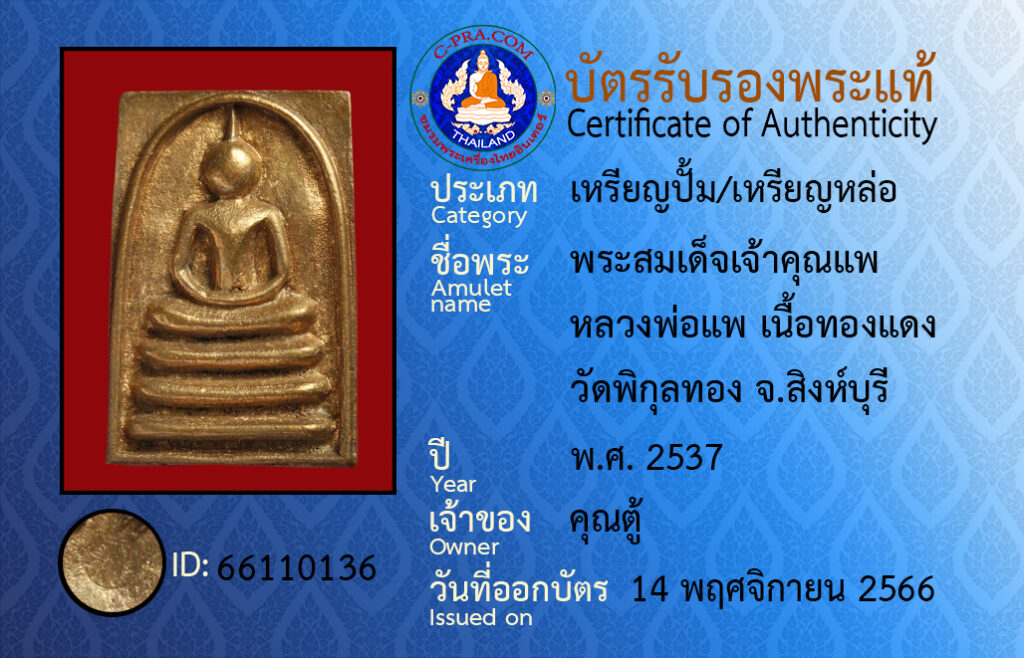 ชื่อพระ :พระสมเด็จเจ้าคุณแพ หลวงพ่อแพ เนื้อทองแดง วัดพิกุลทอง จ.สิงห์บุรี