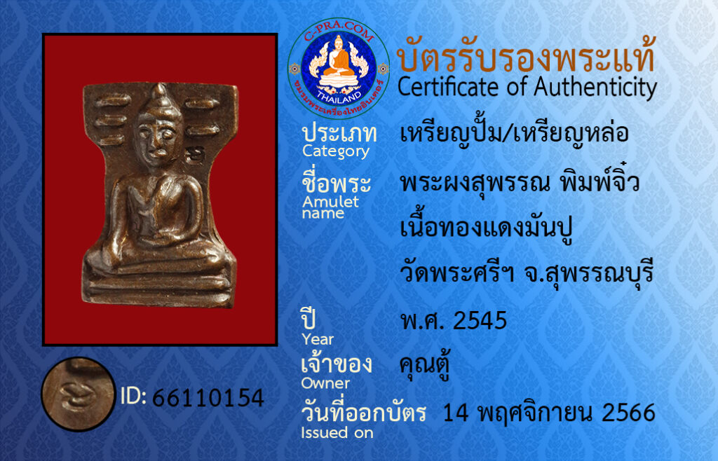 Amulet name : Pra pong su-pan · pim jiw · neua tong daeng man bpoo · wat pra see · Suphan Buri Province