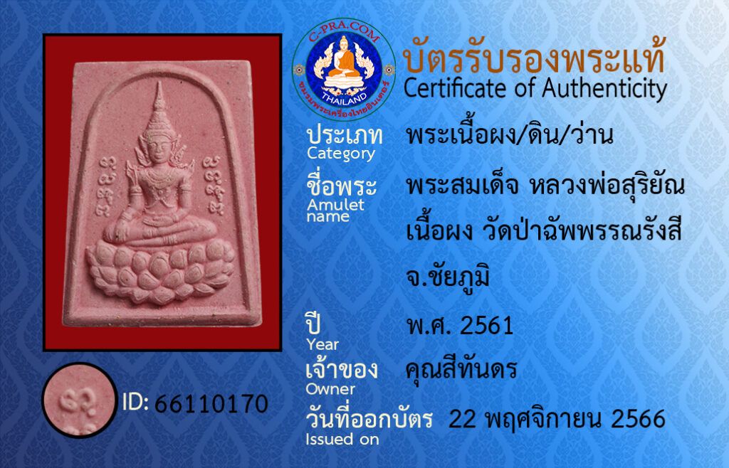 Amulet name :Pra som det · luang por su ri yan · neua pong · wat bpa chap-pan-na-rang-see · Chaiyaphum Province