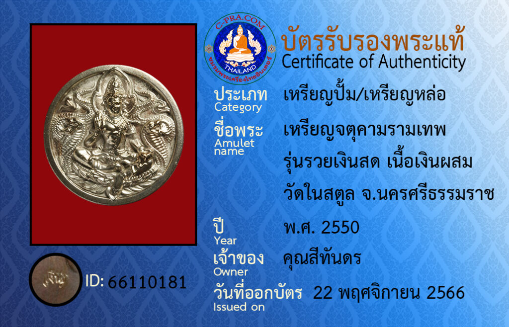 ชื่อพระ : เหรียญจตุคามรามเทพ รุ่นรวยเงินสด เนื้อเงินผสม วัดในสตูล จ.นครศรีธรรมราช