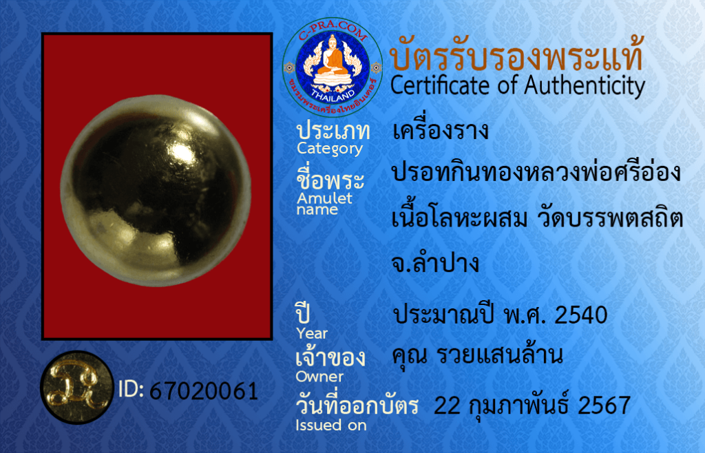ชื่อพระ :ปรอทกินทองหลวงพ่อศรีอ่อง เนื้อโลหะผสม วัดบรรพตสถิต จ.ลำปาง