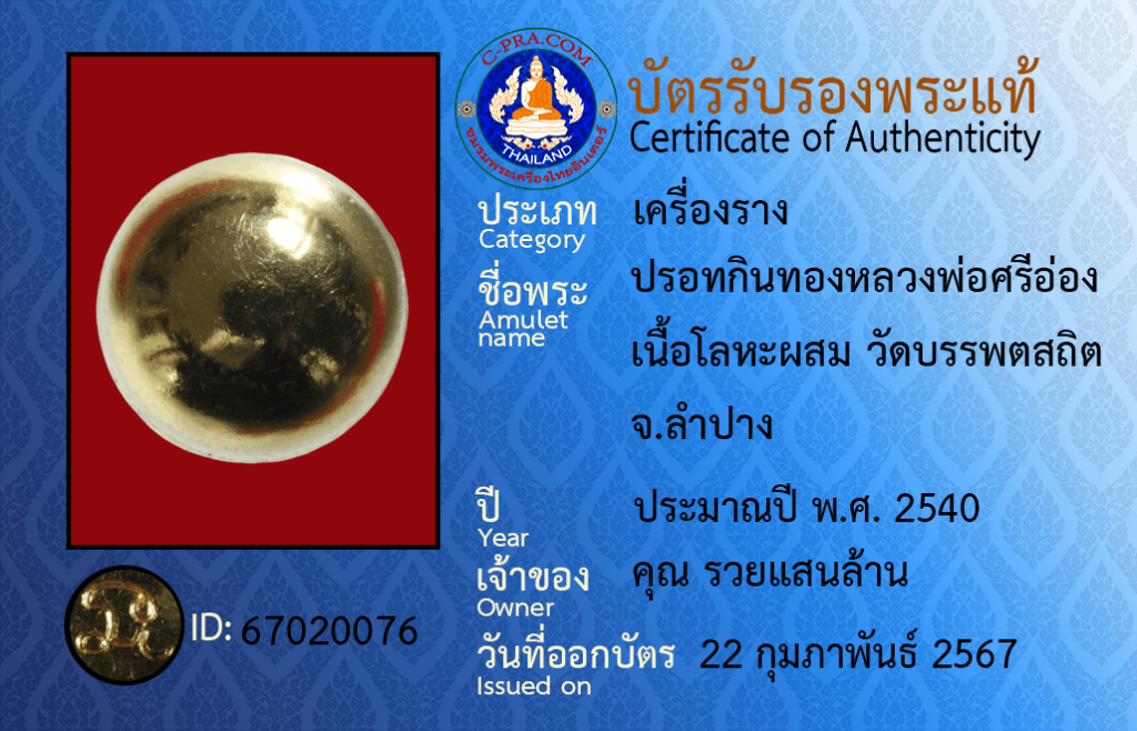 ชื่อพระ :ปรอทกินทองหลวงพ่อศรีอ่อง เนื้อโลหะผสม วัดบรรพตสถิต จ.ลำปาง