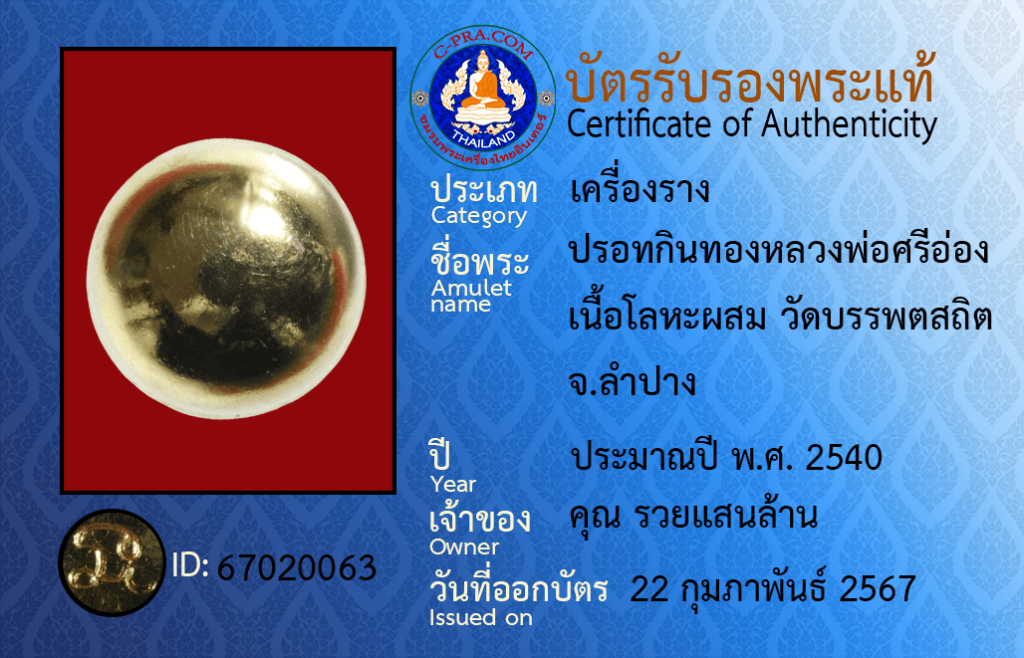 ชื่อพระ :ปรอทกินทองหลวงพ่อศรีอ่อง เนื้อโลหะผสม วัดบรรพตสถิต จ.ลำปาง