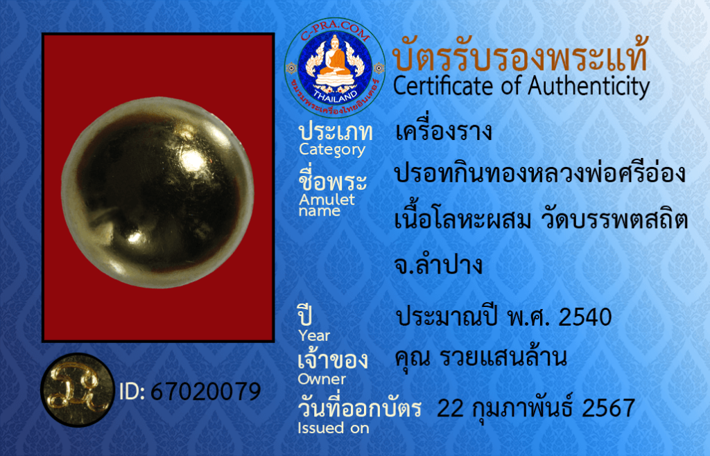 ชื่อพระ :ปรอทกินทองหลวงพ่อศรีอ่อง เนื้อโลหะผสม วัดบรรพตสถิต จ.ลำปาง