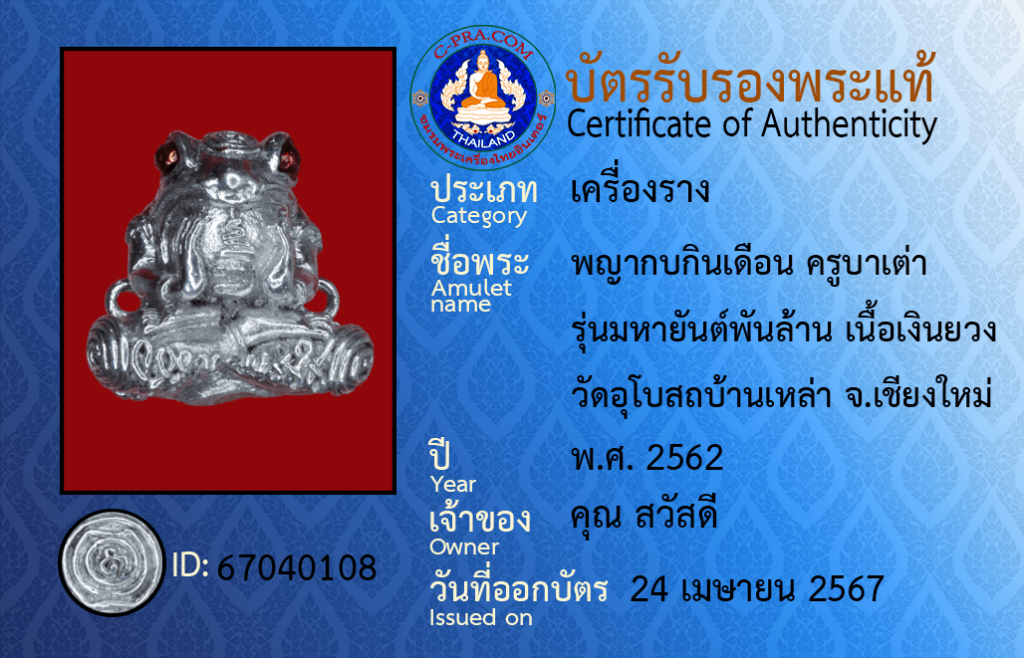 Amulet name :Phaya Frog eats the moon, Kru Ba Tao